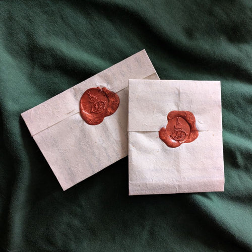 rukopis ve stylu Jane Austen, psaný na ručně vyráběném bavlněném papíře s jemnou strukturou, poskládaný do obálky a uzavřený pravou voskovou pečetí.